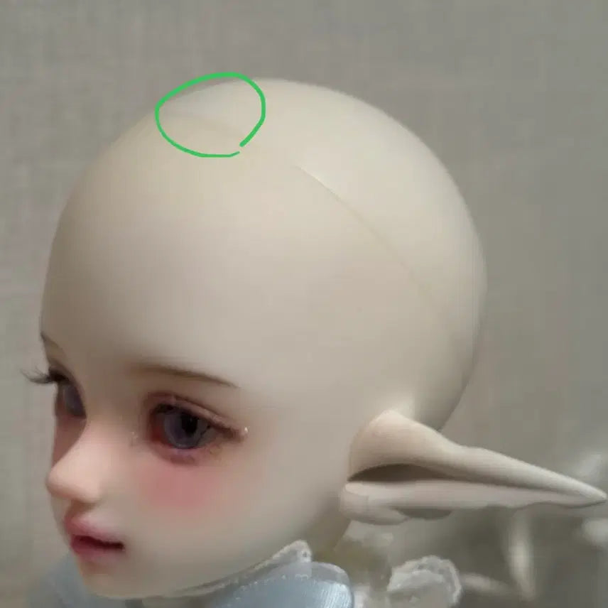 The ears have been customized to resemble fairy ears. There are custom marks on the ears. If you look around the green circle, you'll see a slight blue discoloration. This will be invisible when wearing a wig.