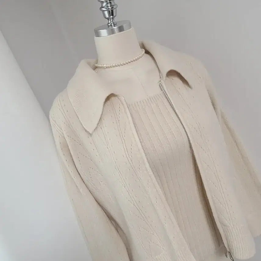 This is a sleeveless zip-up cardigan set.