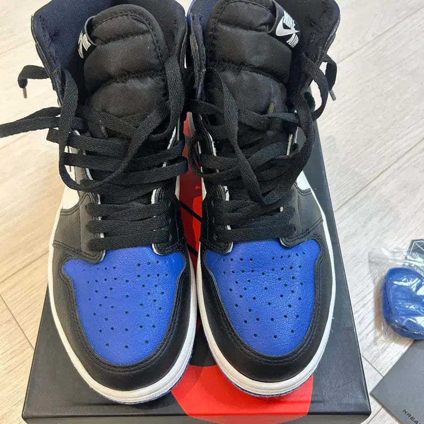 나이키 에어조던1 로얄토 265사이즈 제품입니다. 크림에서 구매했고, 슈구 바른후 1회 잠깐 착용후 보관중입니다 상태 좋습니다