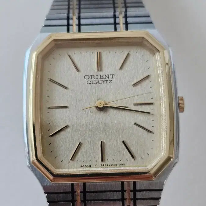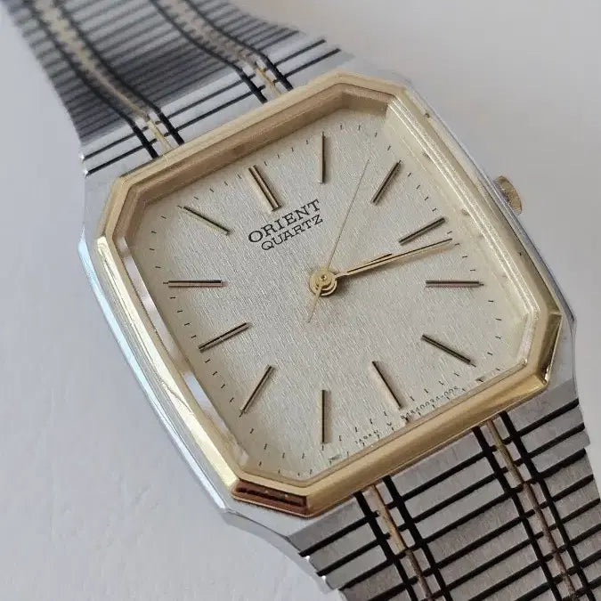 This is an Orient vintage quartz metal watch. The silver metal strap and gold trim add a touch of elegance. The classic design complements any outfit. No questions, just pay securely!