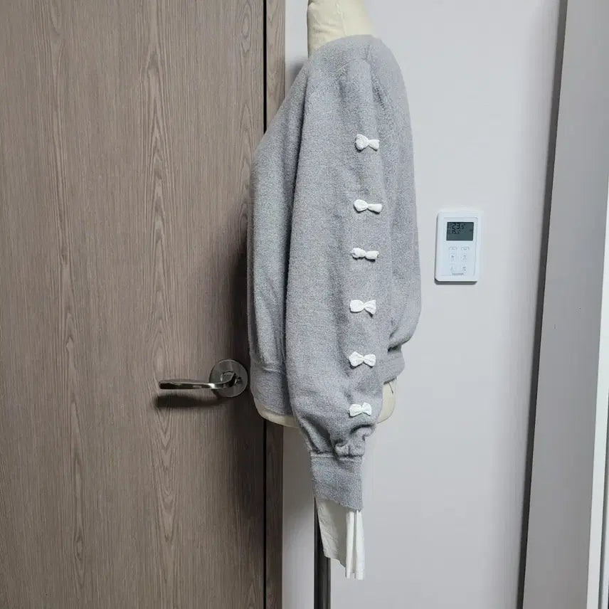 This O'zsec layered knit sweater, released in December 2023, features lovely ribbon details on the sleeves. The grey sweater is made of wool and is in good condition overall, with minor wear and tear, including some staining on the inside of the white cuffs.