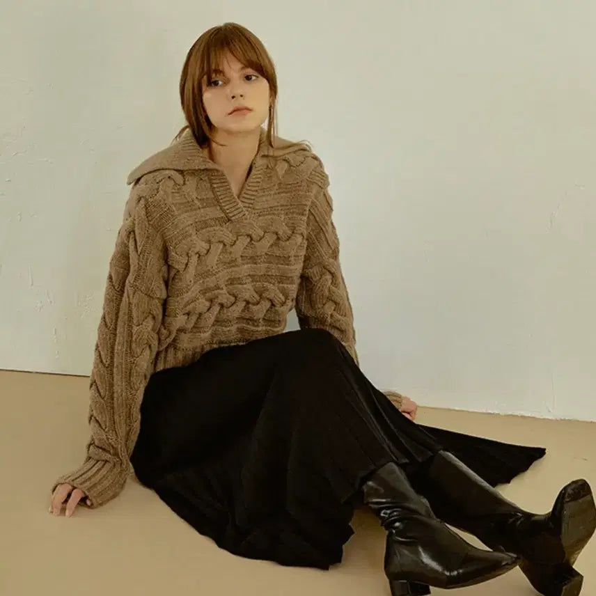 RE_L's cable knit open collar sweater, in brown. This item is sold out.