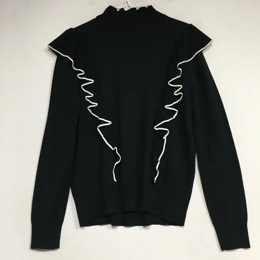 블랙 색상에 화이트 러플 디테일이 포인트인 니트입니다.