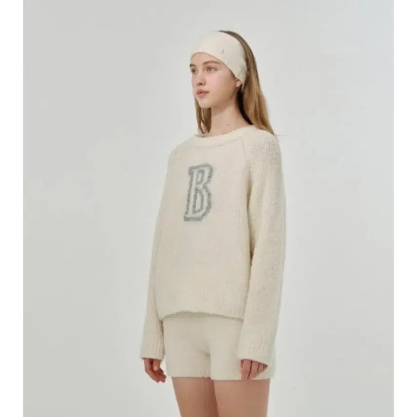 The Barnet boucle knit sweater in ivory. The boucle fabric has a unique texture. The B logo on the front is a highlight.