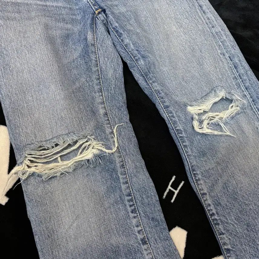 무릎 부분과 밑단 부분에 자연스러운 컷팅이 들어간 데님 입니다