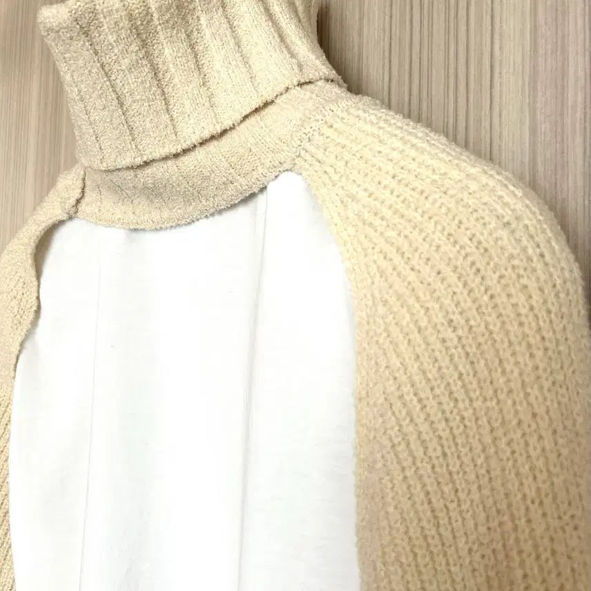 Unique bolero knit, transitioning from a turtleneck to sleeves.