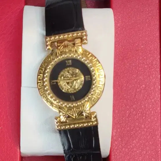 베르사체 정품 금장 가죽 시계입니다. 블랙 가죽 밴드와 금색 베젤의 조화가 고급스럽습니다. 시계 케이스에 보관되어 있어 상태 좋습니다.