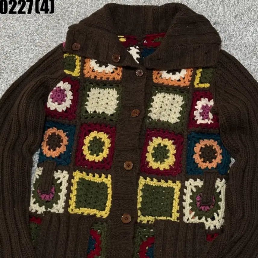 This vintage brown cardigan features a unique knit patch design.