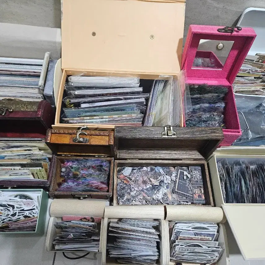 Offering a complete vintage deco set, including storage boxes, pouches, and tin cases (over 20 items). The price has been reduced to reflect the sale of some storage units.