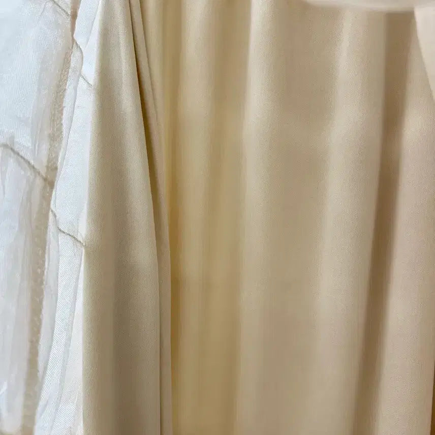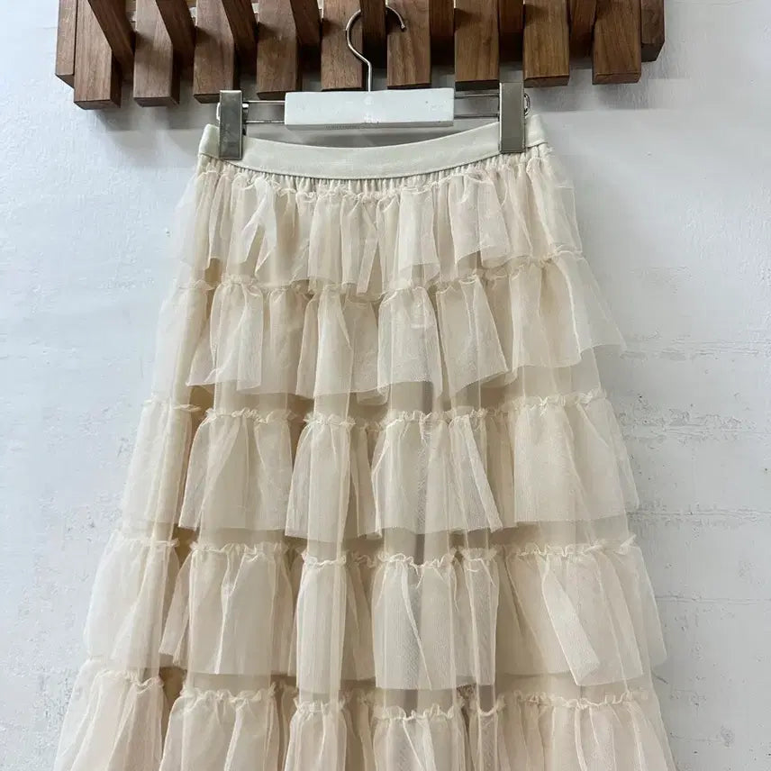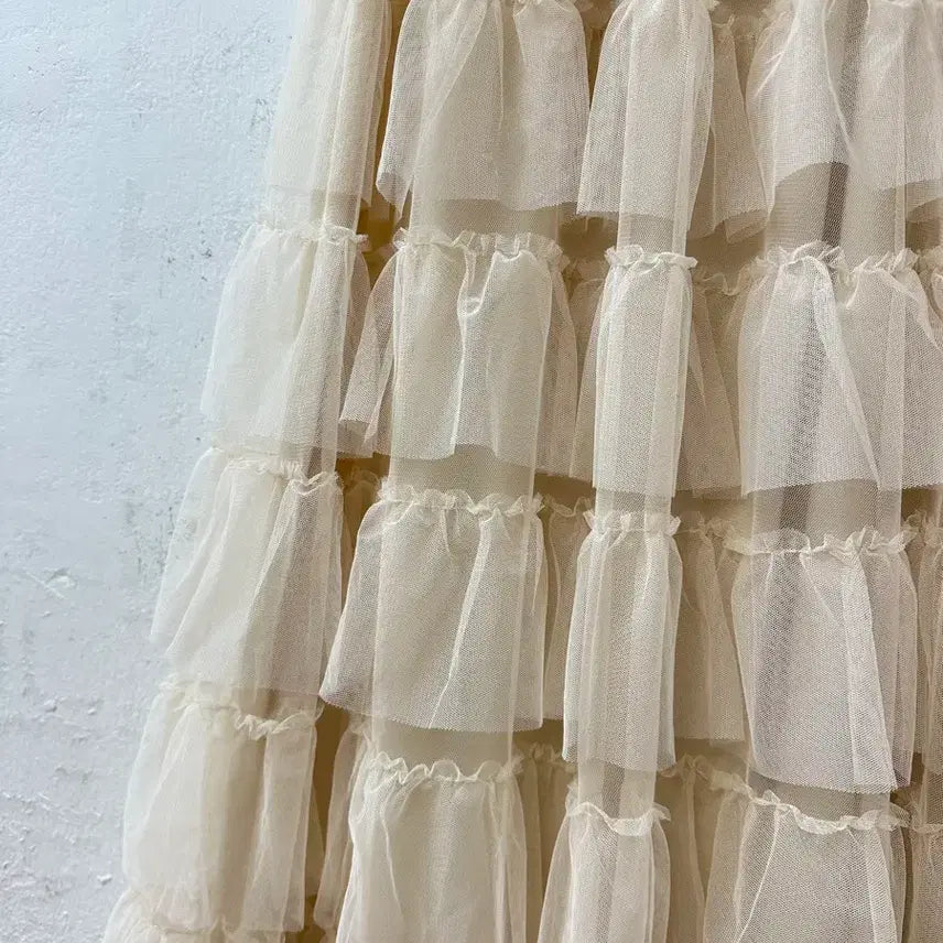 은은한 아이보리 컬러의 티어드 튤 롱스커트입니다.