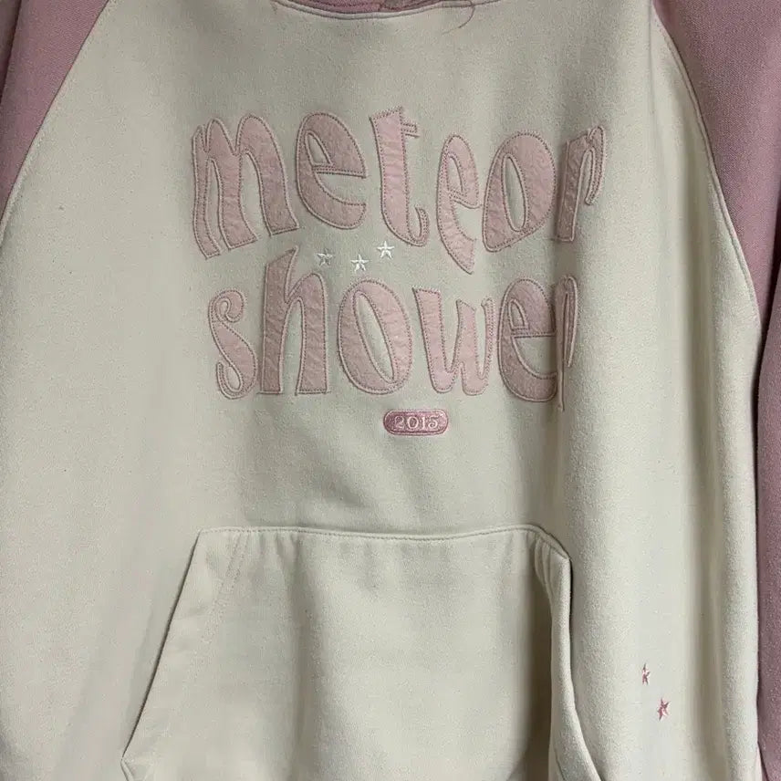 더블유브이프로젝트 메테오샤워 핑크 후드티에요!톤다운된 핑크색과 크림색 조합이 이뻐용 넉넉한 사이즈로 편하게 입을 수 있습니다.