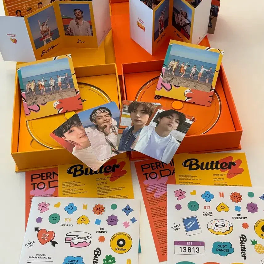 BTS 버터 앨범 초판 특전 상품입니다. 앨범 구성품은 사진에 보이는 포토카드, 스티커, 가사집, CD 등 풀세트로 드립니다. 문의 없으시면 바로 안전결제해주시면 됩니다! 포카 총 4장 뷔2, 진1, 슈가1 폴딩메세지카드 뷔, 알엠 .