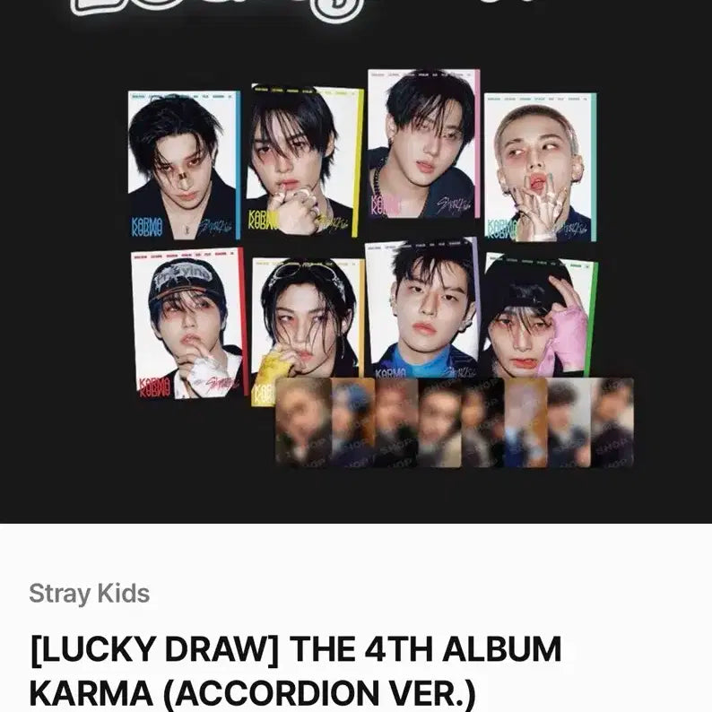 [LUCKY DRAW] THE 4TH ALBUM KARMA (ACCORDION VER.) 스키즈 카르마 팬즈 럭키드로우 아코디언버전 구성 : 특전 포카 아코디언 앨범 엽서 아코디언 앨범포카 2장 - 아코디언 창빈이는 세트가 나오지 않아 다른 멤버로 맞춰드립니다 문의 없으시면 바로 안전결제해주시면 됩니다!