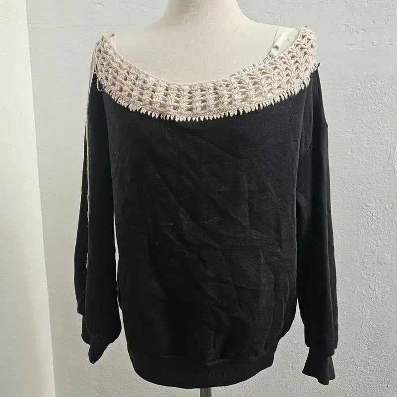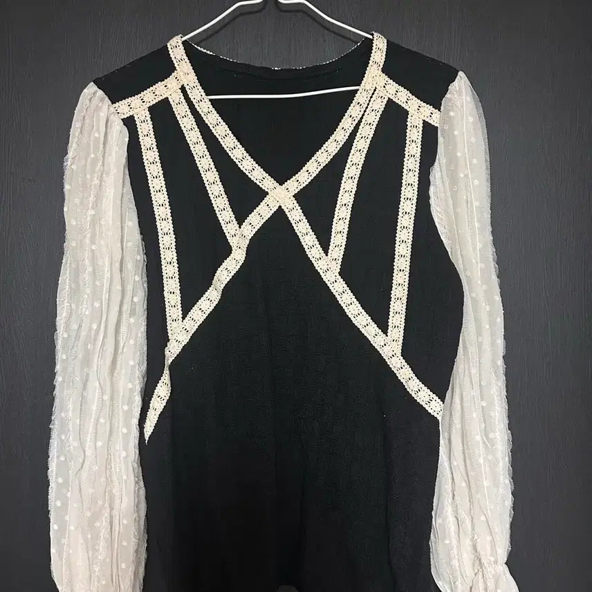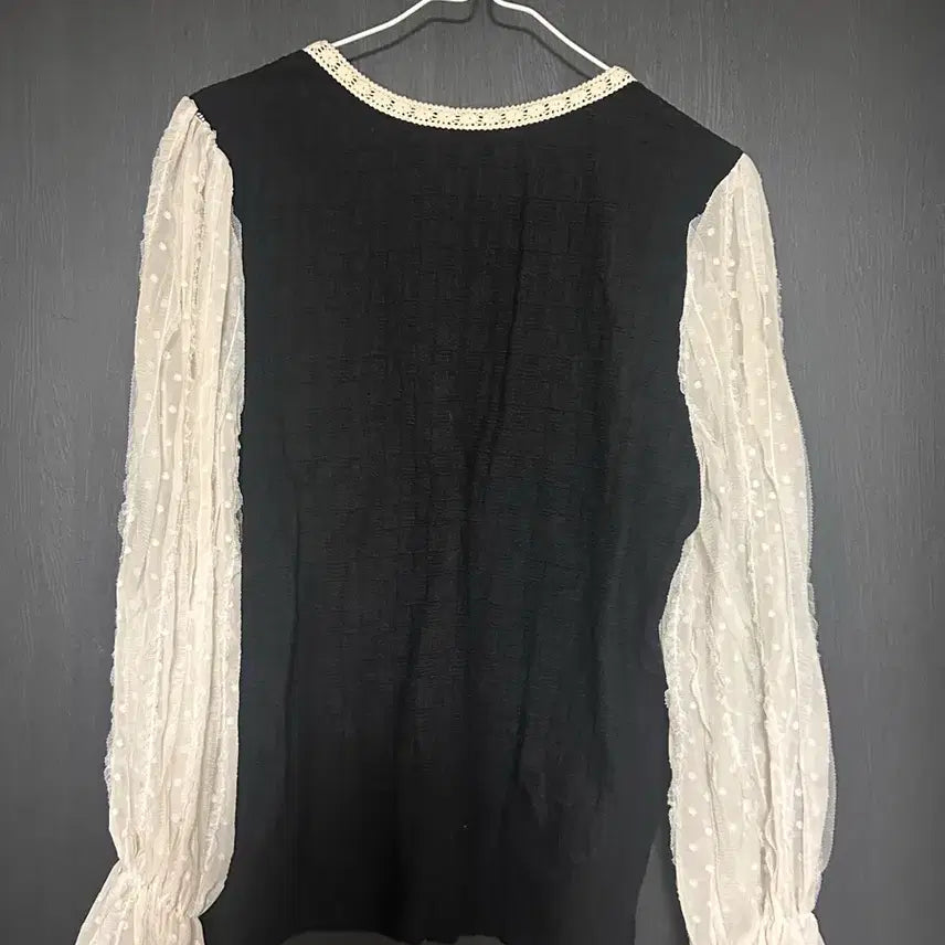 [BUNJANG] Black Lace Blouse with See-Through Sleeves / 레이스 블랙 블라우스 시스루 소매
