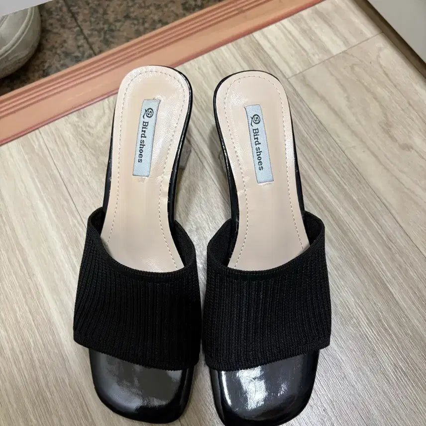 니트 소재로 되어있는 블랙 색상 뮬 샌들입니다. 230 사이즈이고, 굽은 투명한 아크릴 굽으로 되어있습니다. 착용감 편하고, 슬랙스나 스커트 모두 잘 어울립니다.