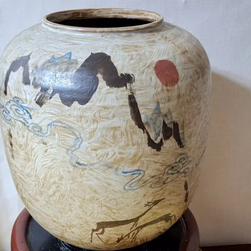 The jar is made of Buncheong ware with blue and red painting, resembling a picturesque artwork. The unique texture of the Buncheong ware provides a pleasant tactile experience.