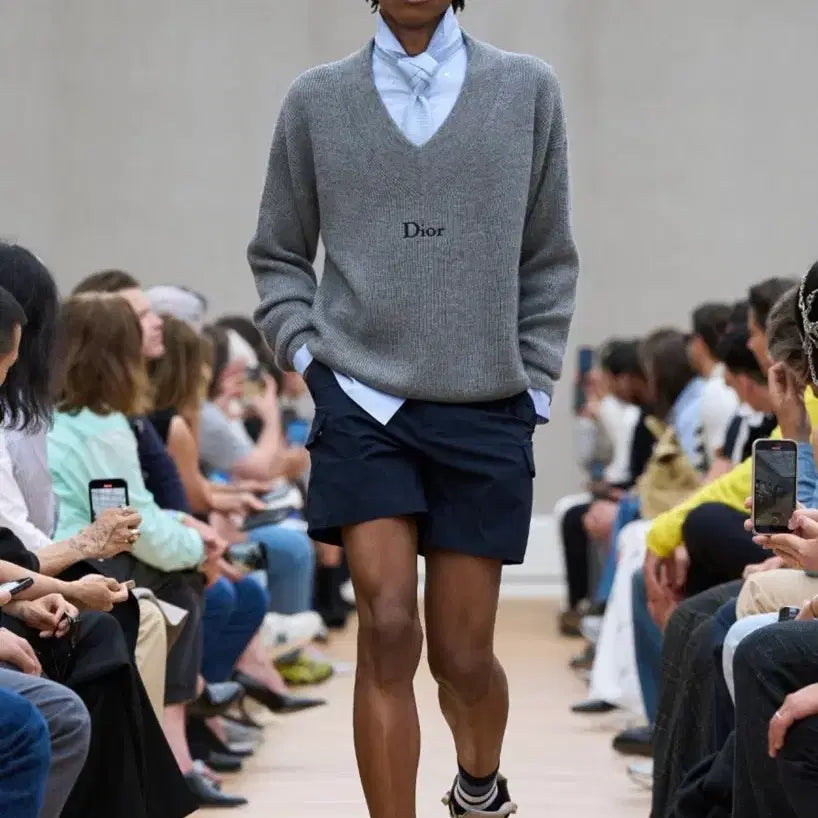 This Dior embroidered sweater, designed by Jonathan Anderson for the 26 Spring/Summer collection, offers an oversized fit. Crafted from a blend of gray wool and alpaca knit, this piece is a key item from the collection. Purchased from the Shinsegae Gangnam men's store. The sweater, size M, fits like a 105. It is in excellent condition, having been worn only once. Includes shopping bag, invoice, and purchase receipt.