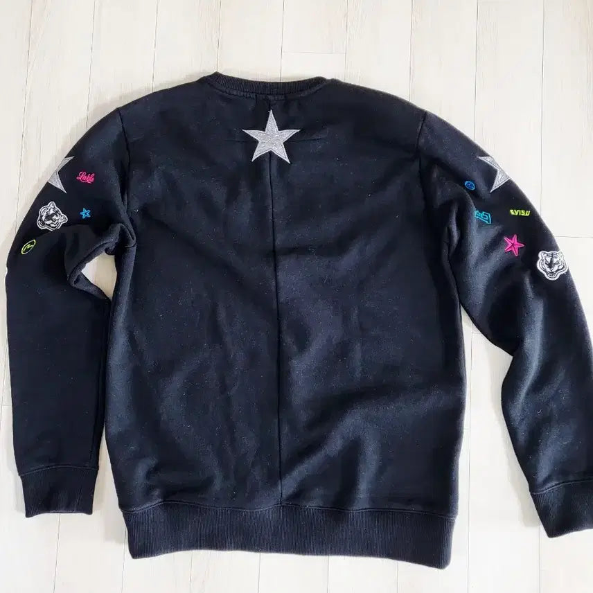 에비수 검정색 맨투맨에 별 자수가 놓여 있습니다. 독특한 디자인이라 포인트 주기 좋습니다. 상태 좋은데 옷 정리하려고 저렴하게 판매합니다. 문의 없으시면 바로 안전결제해주시면 됩니다!
