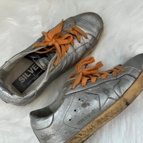 Authentic Golden Goose silver sneakers, size 36 (fits 230-235). Purchased directly from the Gwangju Shinsegae Department Store. The sneakers are in excellent condition, with no stains or damage. They are a limited edition model. The soles have been reinforced with shoe goo for added protection. Does not include box or dust bag. 100% authentic.