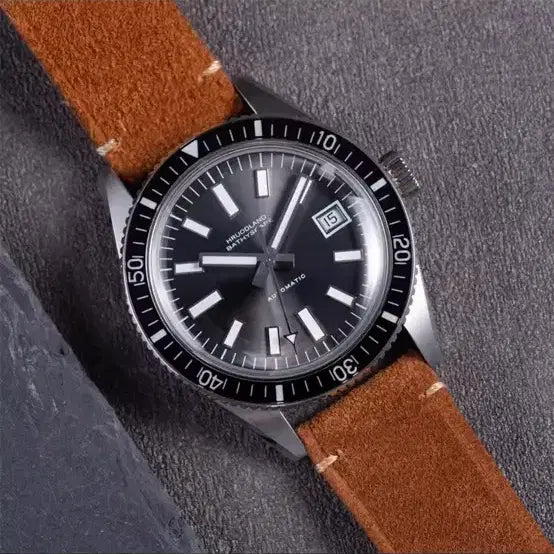 The Hruodland f031 Bathyscape is an automatic watch featuring a grey sunray dial and domed glass.