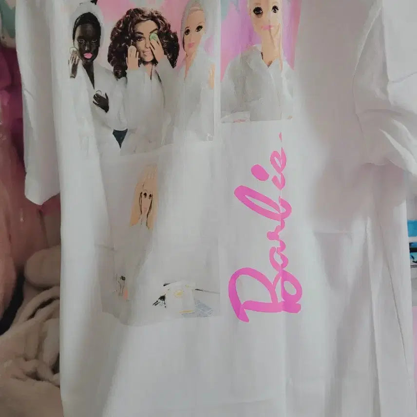 바비 스파 반팔 티셔츠입니다. 흰색 바탕에 바비 스파 그림이 프린팅되어 있습니다. 편하게 입을 수 있는 면 소재입니다.