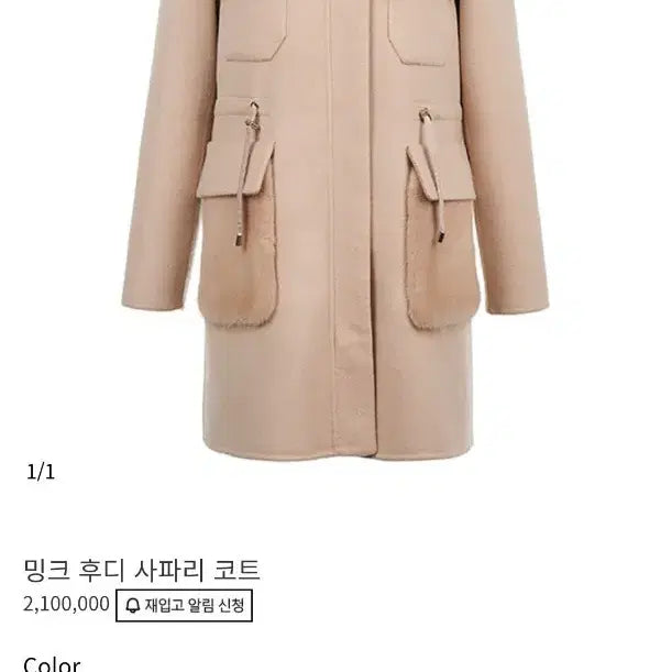 베이지색이며, SAGA FURS 인증된 밍크 퍼가 후드와 포켓에 적용되어 고급스러움을 더합니다
