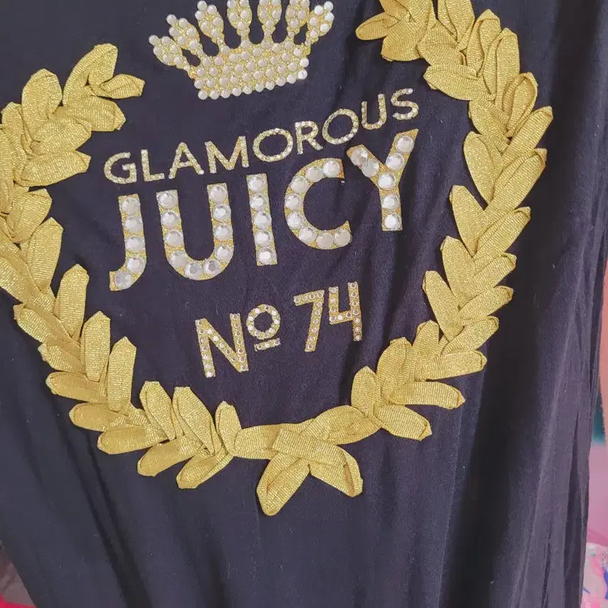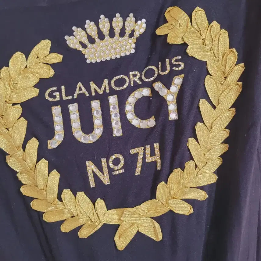 블랙 쥬시꾸뛰르 반팔 티셔츠입니다. 중앙에 큐빅 장식과 금색 자수가 화려하게 놓여 있습니다. 사이즈는 XS이니 상세 치수 확인 후 구매 부탁드려요!