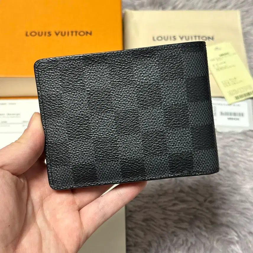 This is a pre-owned Louis Vuitton Damier Graphite Multiple Wallet. The wallet is in excellent condition, rated 9.5/10, with no leather curling or corner wear. The interior is also in great shape. It's the newer version of the Damier Graphite, which originally retailed for 1.13 million KRW. The wallet comes with all original components, including the invoice. Please contact me for more details.