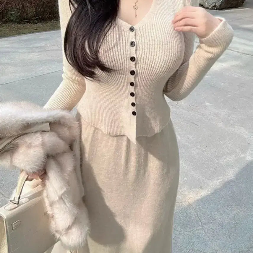 쫀쫀한 짜임의 라이트 베이지색 셋업입니다. 뉴 딥 라인으로 세련된 무드를 연출할 수 있습니다. 격식 있는 자리에도 잘 어울리고, 데이트룩으로도 손색없어요. 별도 문의 없으시면 바로 안전결제 부탁드려요!