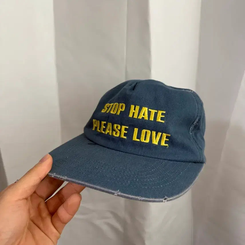 This navy blue no-collar ballcap features an embroidered "STOP HATE PLEASE LOVE" message. There's some damage detailing on the brim. If you have no further questions, you can purchase it immediately with secure payment!