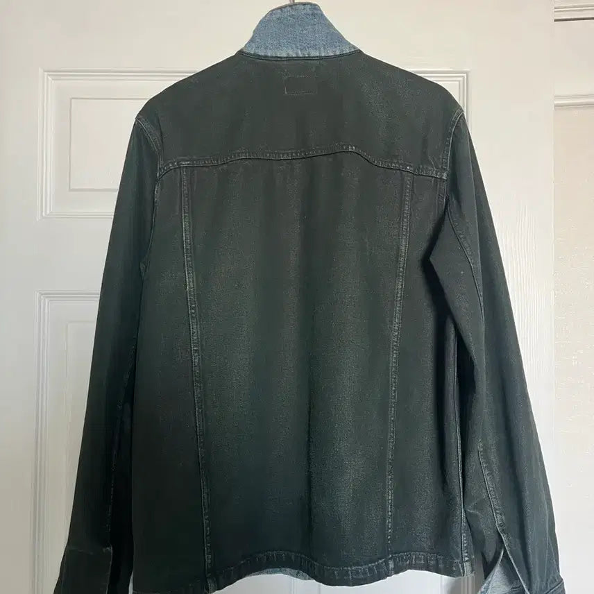 누디진 그린 캡슐 데님 자켓입니다. 깃과 소매 부분을 제외한 나머지 몸판이 코팅된 제품입니다. 전체적으로 블랙에 가까운 색상이며 소매 롤업하면 코팅되지 않은 연청과 대비를 이루는 매력적인 제품입니다. 누디 자수부분이 코팅되어 은은하게 보이는 매력이 있습니다.