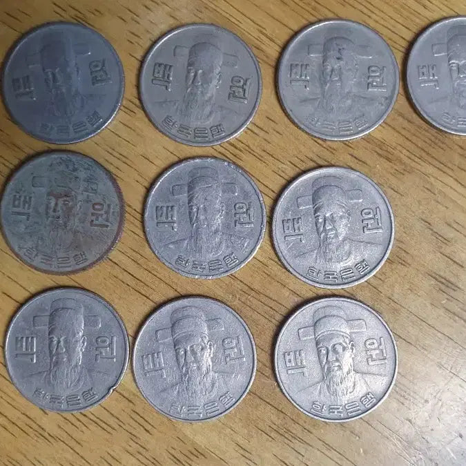 100원짜리 옛날 동전 10개 일괄 판매합니다. 오래된 동전이라 사용감은 있지만, 전체적으로 상태는 양호합니다.