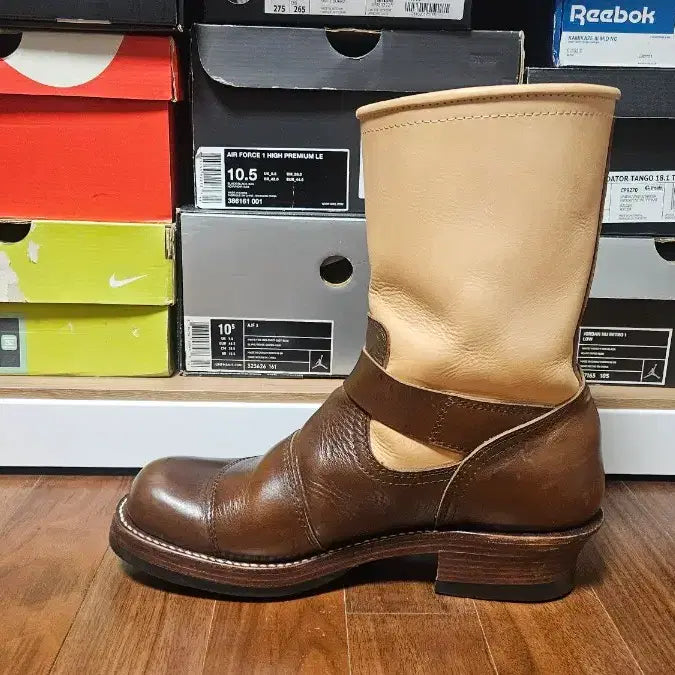 This is a Root One Two-Tone Engineer Boots, crafted from Chrome Axel leather. This boot features a brown and beige two-tone combination with leather detailing on the instep.