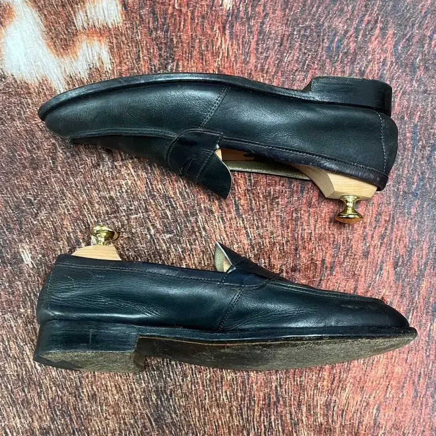 영국을 대표하는 프리미엄 슈즈 브랜드 TRICKER'S의 페니 로퍼입니다. 브랜드 특유의 묵직하고 견고한 가죽 질감이 일품이며, 클래식한 디자인으로 격식 있는 자리부터 캐주얼한 착장까지 전천후로 활용 가능한 아이템입니다. 전체적으로 자연스러운 가죽 주름과 사용감이 느껴지는 빈티지한 컨디션 유지 중입니다.