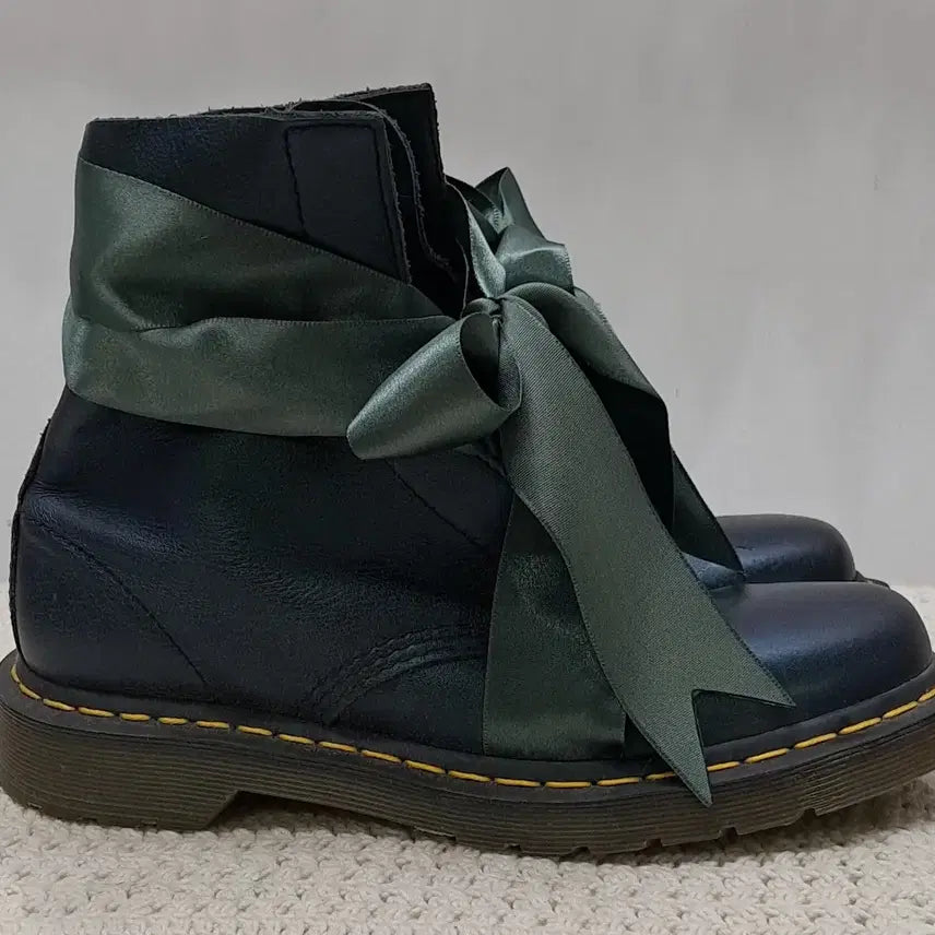 닥터마틴 구두에 리본으로 포인트를 준 제품입니다. UK5 사이즈이며, 톤 다운된 녹색 리본이 묶여있어 유니크합니다. 닥터마틴 특유의 튼튼함과 리본의 조화가 돋보이는 구두입니다. 문의 없으시면 바로 안전결제해주시면 됩니다!
