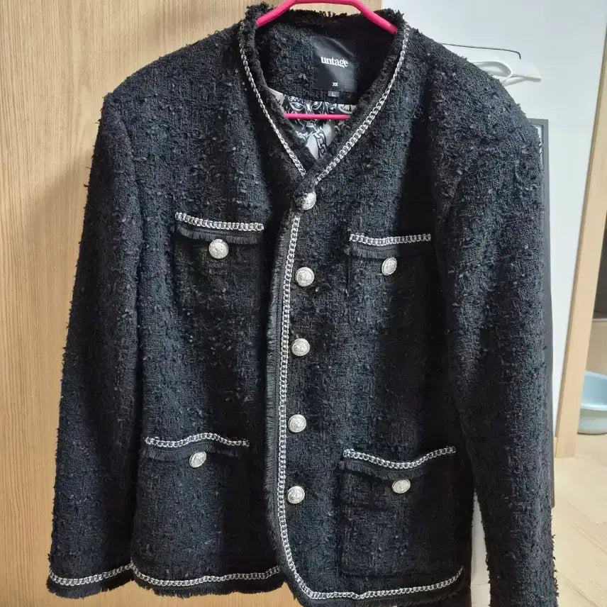 블랙 색상의 언지티 트위드 자켓입니다. 체인 프린지로 포인트를 주어 유니크한 느낌을 줍니다. 트위드 소재로 제작되어 고급스러움을 더했습니다.