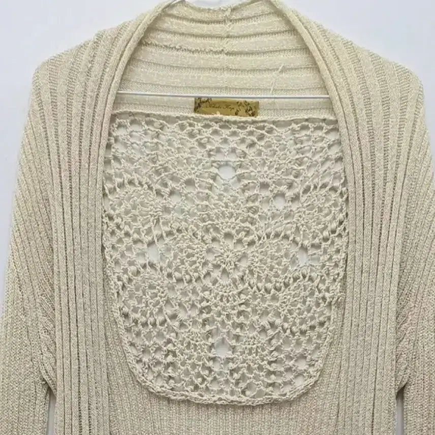 This vintage-style beige cardigan features unique knit detailing on the back. Perfect for layering and suitable for spring, summer, and autumn wear.