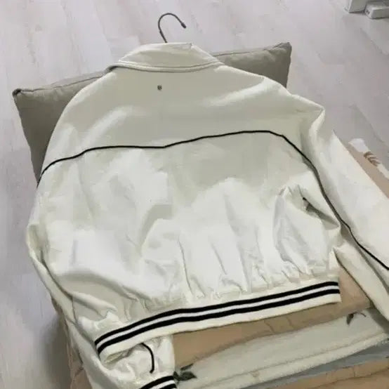 Ivory색상의 CTBRZ 라인포인트 바시티점퍼입니다.검정색 라인 디테일이 포인트로 들어가 있습니다. 캐주얼하게 코디하기 좋은 아우터입니다. 3,4번 사진 약간 오염있어요