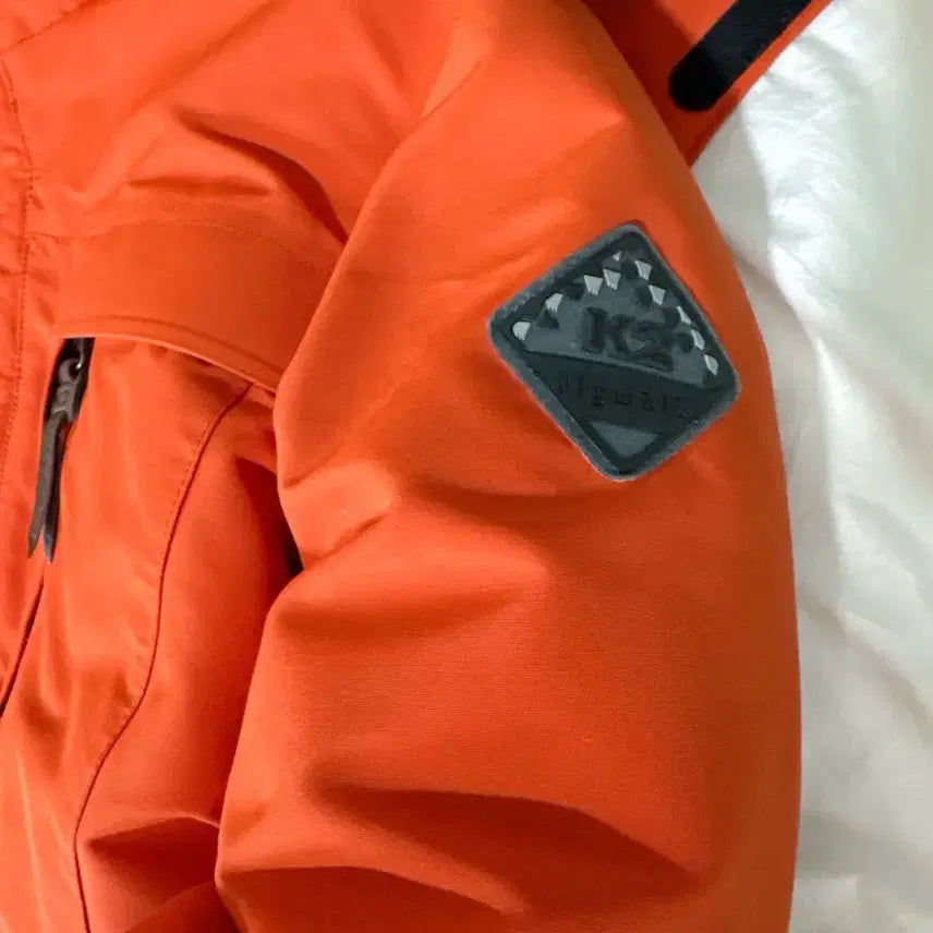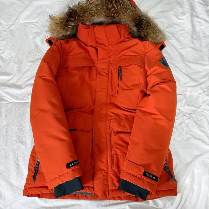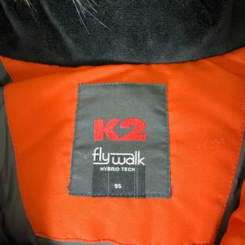 This is a K2 Flywork women's goose down padded jacket in size 95. The hood is detachable, and the down is in excellent condition. The orange color brightens your face. If you have any questions, please proceed with secure payment immediately!