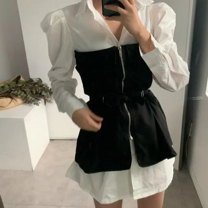 [BUNJANG] Layered V-Neck Mini Dress / (한번착용)블랙 뷔스티에 셔츠 레이어드 원피스