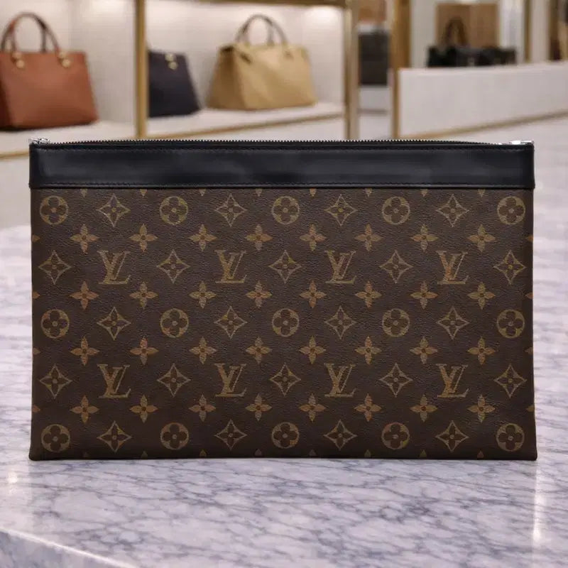 하우스의 상징적인 모노그램 이클립스 캔버스 소재를 사용하여 클래식하면서도 현대적인 분위기를 자아냅니다. 코팅 캔버스 특유의 견고함 덕분에 습기와 오염에 강한 내구성을 자랑하며, 시간이 지나도 형태가 쉽게 무너지지 않아 외관 보존율이 뛰어난 것이 특징입니다. GM 사이즈 규격의 넉넉한 내부 공간은 서류나 태블릿 기기 등 부피가 있는 소지품을 여유롭게 수납하기에 최적화되어 있으며, 내부의 플랫 포켓을 통해 작은 물건들을 체계적으로 분리하여 관리할 수 있습니다. 지퍼 클로저 방식을 채택해 내용물을 안전하게 보호하며 넓은 개방감을 제공하고, 군더더기 없는 슬림한 실루엣 덕분에 클러치로 단독 사용하거나 큰 가방 속의 파우치로 활용하기에도 매우 실용적인 아이템입니다.