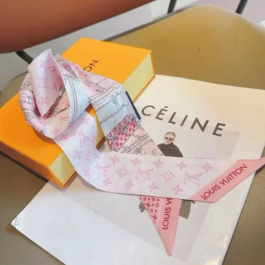 This is a new Louis Vuitton silk scarf for women. Made with a subtle pink silk material, it exudes luxury. It can be styled in various ways, such as a ribbon, hair tie, or necktie.