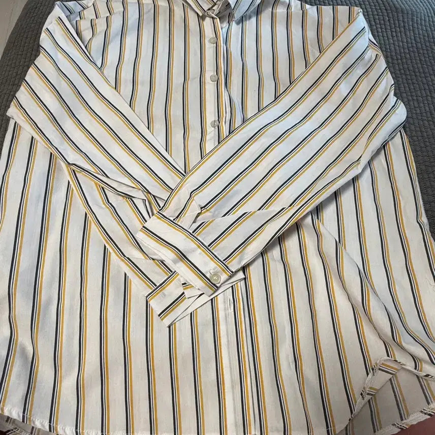 Purchased from the Shinsegae Department Store. This yellow striped shirt is in excellent condition, worn only a couple of times. It's made of high-quality material and is very stylish. Recommended for women's sizes 55-66. Free size.
