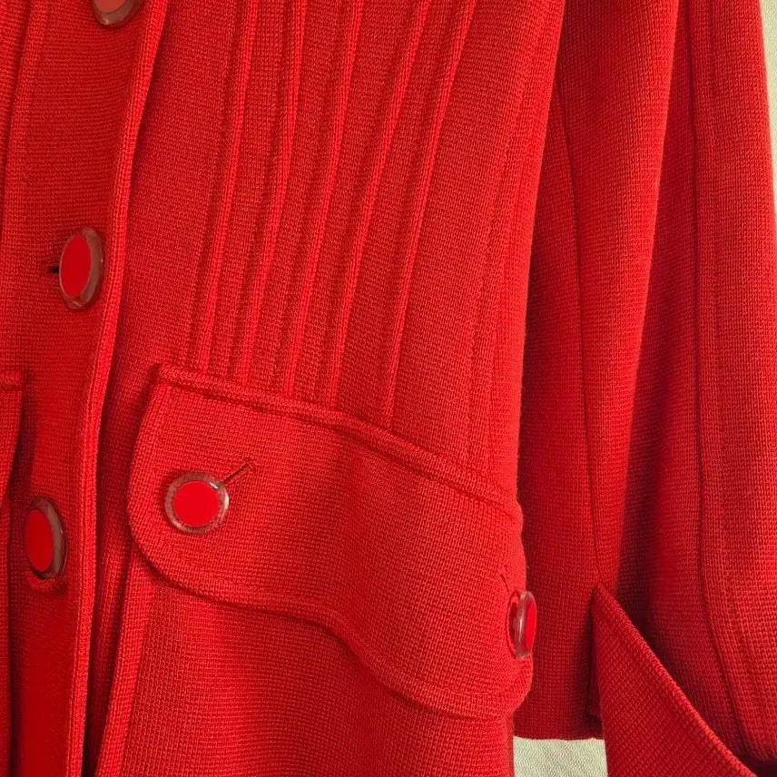 This is a bright red long coat. The knit material is warm and comfortable. The fit is beautiful, so I think it'll be versatile! The waistline is also nice.