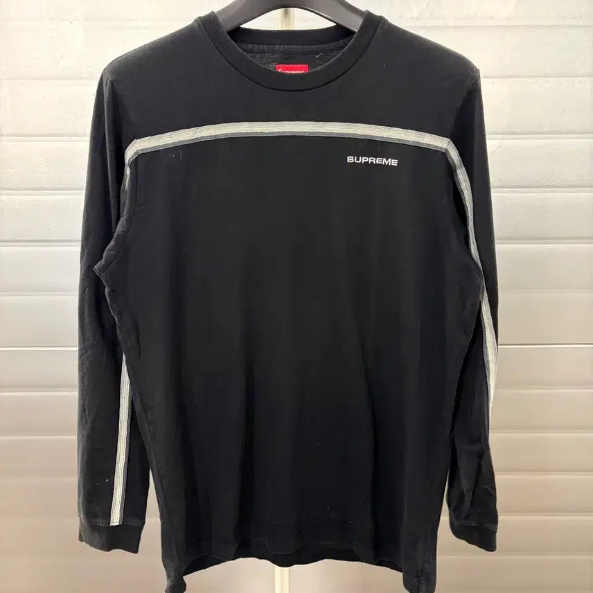 Black Supreme long sleeve t-shirt, size M. Features a silver stripe across the chest. A versatile design, easy to coordinate. Please feel free to ask if you have any questions.