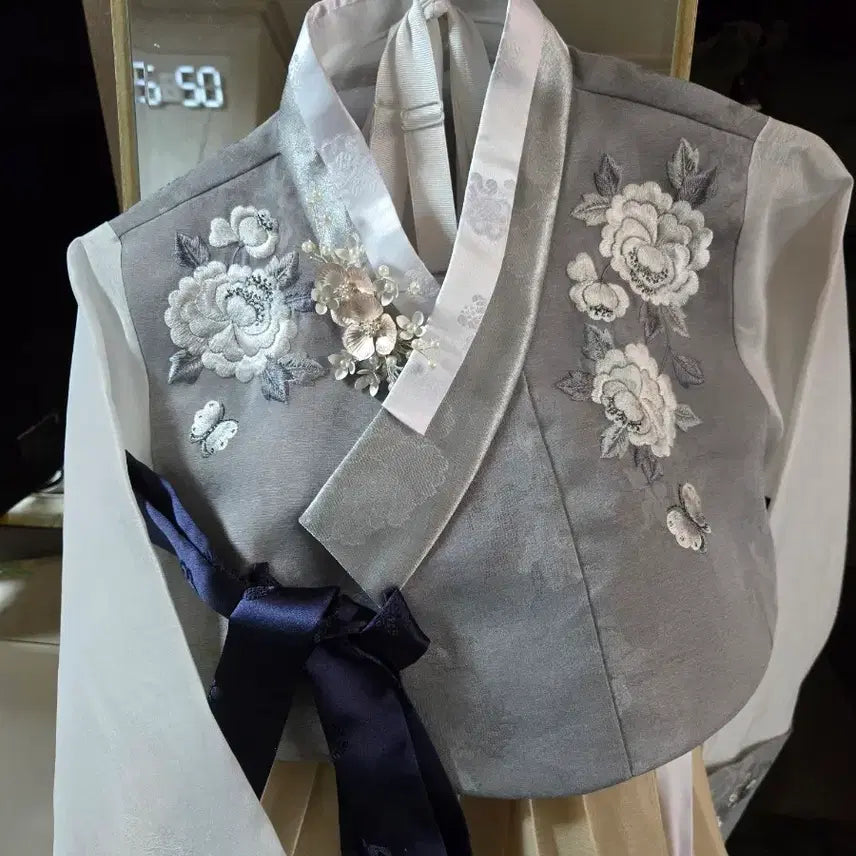 This is a brand new, never-worn adult Hanbok set, purchased a week ago. It features a gray jacket and an ivory skirt. The jacket and skirt are delicately embroidered with floral and butterfly patterns.